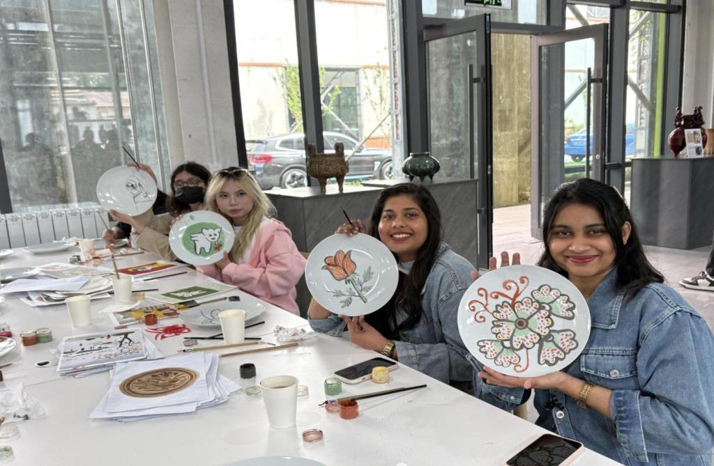 在红绿彩主展区,留学生们在国家级非遗传承人的悉心指导下开启沉浸式创作。从揉泥到塑形,他们小心翼翼地操作着,将脑海中的奇思妙想化作瓶、碗、罐的独特轮廓,东方古韵与异域风情在陶泥上悄然相遇。来自越南的留学生PHAM THI THANH BINH专注而细致地揉捏陶泥,将湄公河畔的藤蔓纹样巧妙融入梅瓶造型,让传统技艺与异国文化在指尖交融;斯里兰卡留学生MUDANNAYAKAGE DINITHI KAUSHALYA则巧妙运用几何美学,在素坯上勾勒出异域风格的釉下彩纹样,展现出独特的艺术创造力。“这不仅是技艺传承,更是审美共识的建立”,研学院院长在观摩创作时指出,留学生们带来的多元文化基因,正为古老技艺注入国际化表达的新可能。
