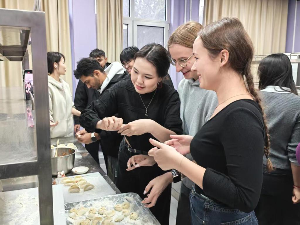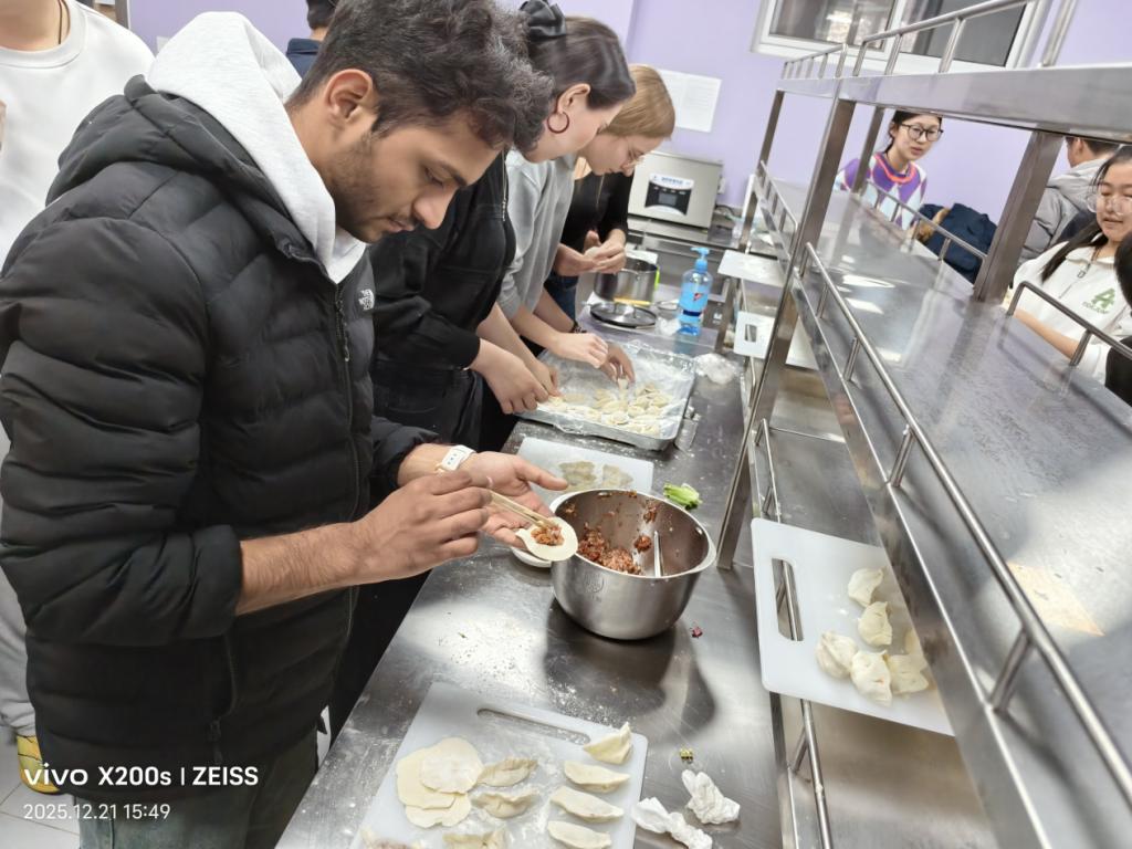 从擀皮、填馅到捏合,小小的饺子不仅包裹着鲜美馅料,更承载着留学生们对中国传统文化的好奇与喜爱。活动过程中,教师还向同学们介绍了冬至作为重要节气的由来,分享了“吃饺子防冻耳朵”的民间传说,以及中国各地不同的冬至饮食习俗,让大家在动手体验的同时,进一步理解了节日背后的文化内涵。